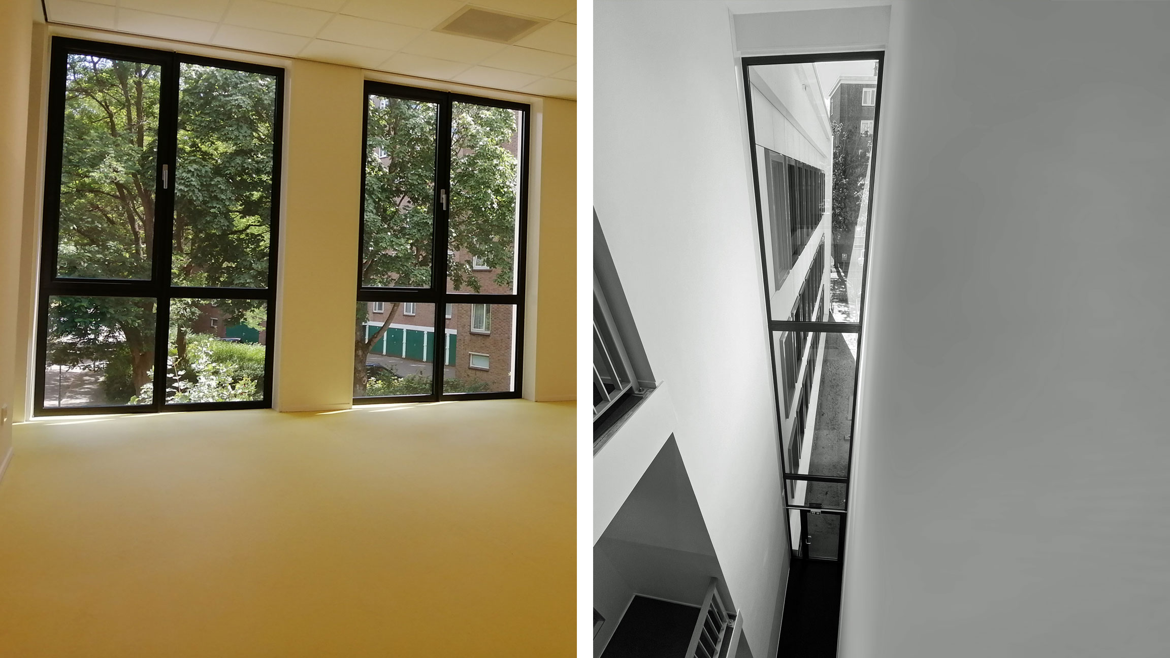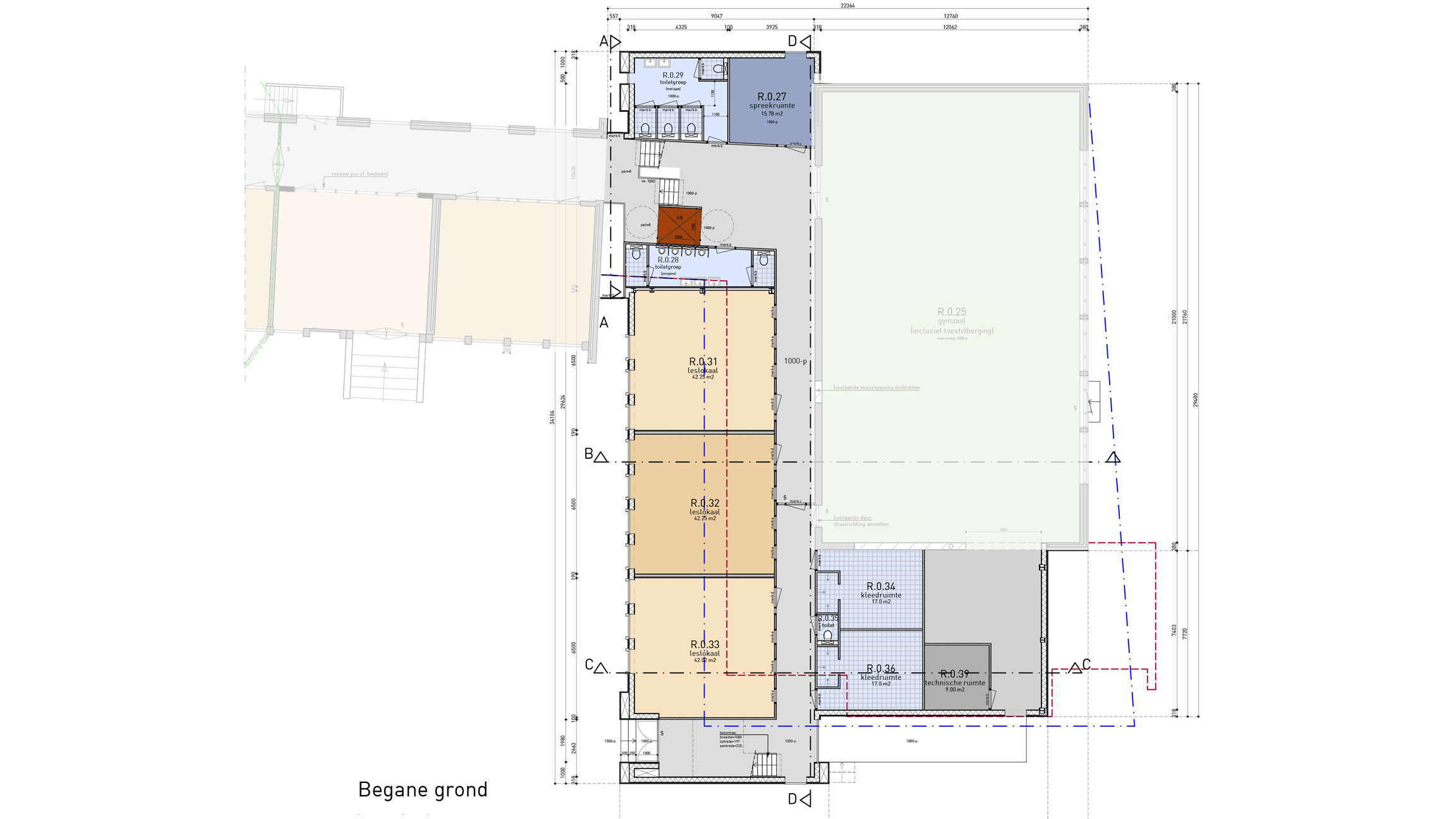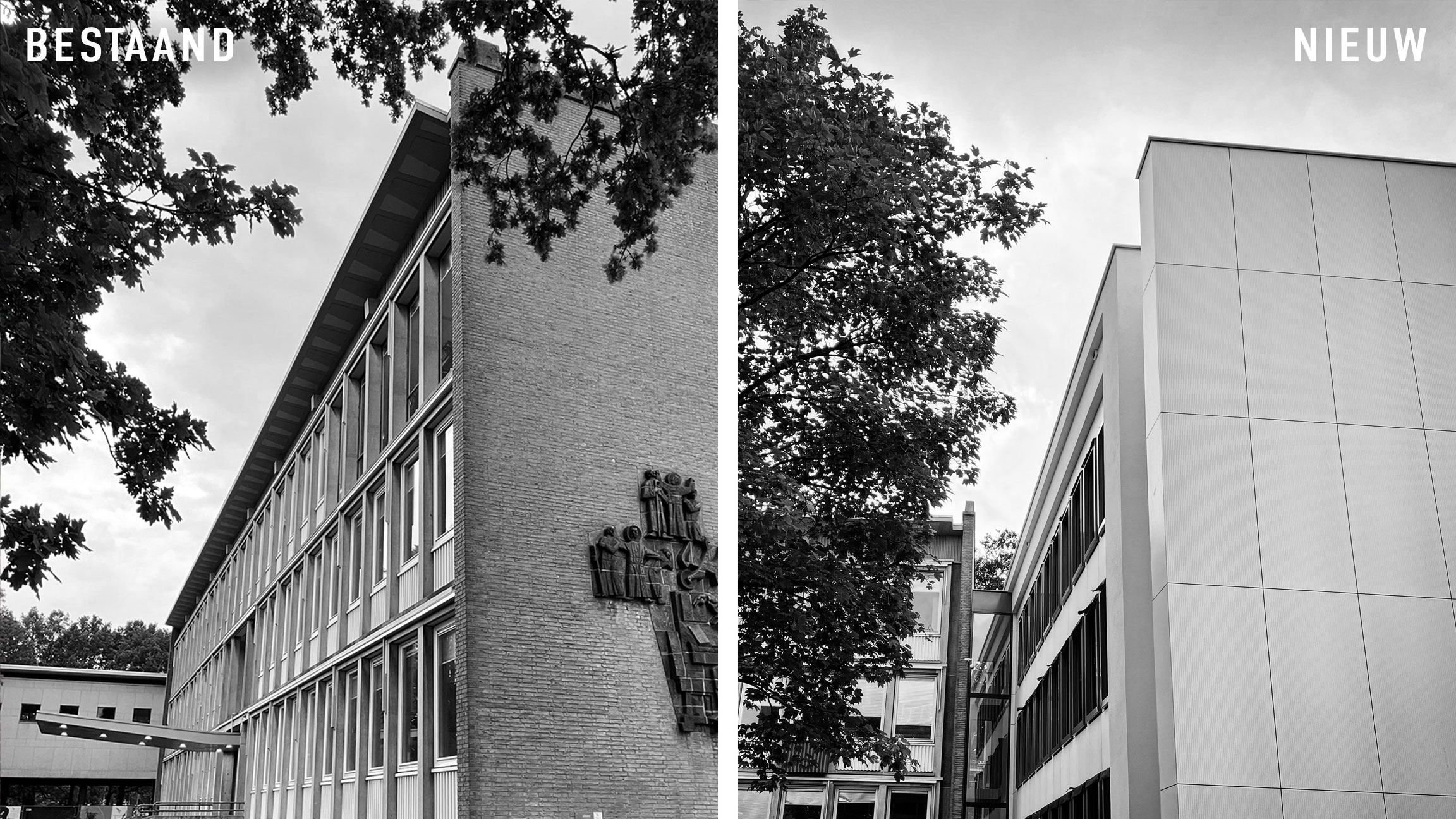 Ter vervanging van een laag tussendeel is een nieuwe compacte vleugel met lokalen ingepast. Het eigentijdse ontwerp is geïnspireerd op de wederopbouwarchitectuur van de bestaande school en verbindt alle delen opnieuw. Voor fase 2 renovatie voerden we een kleurhistorische verkenning uit.