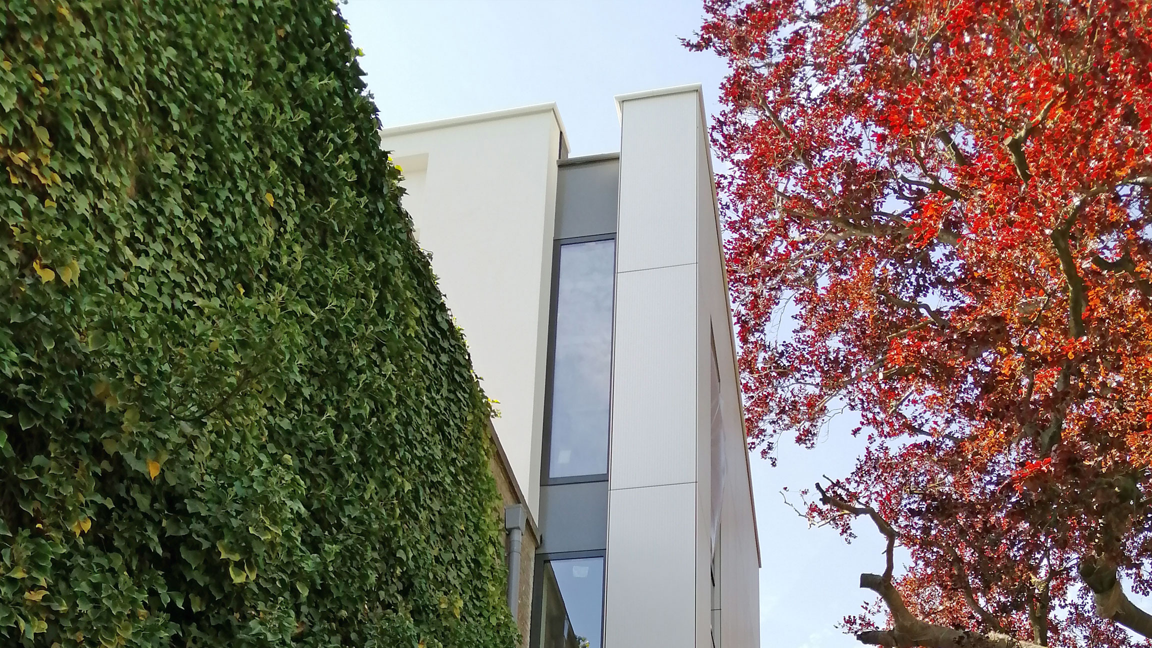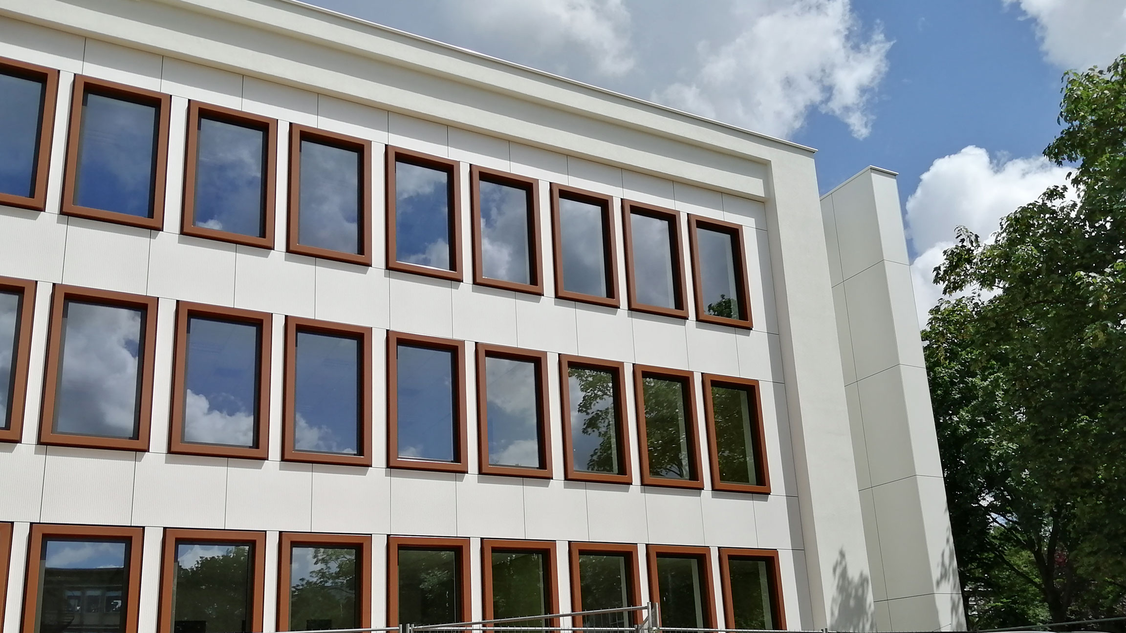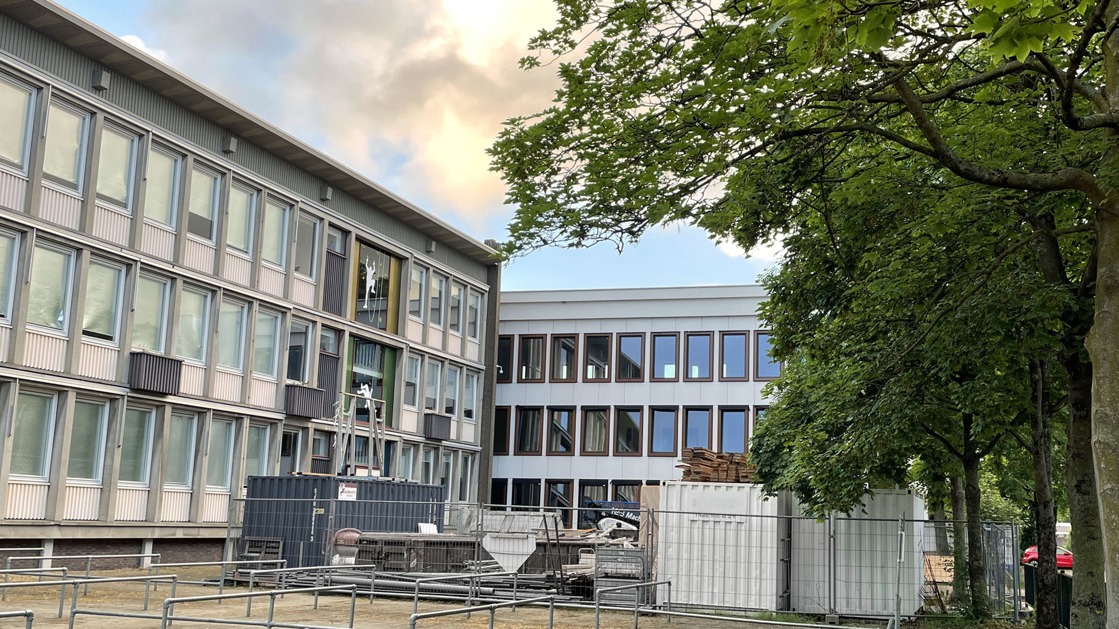 Ter vervanging van een laag tussendeel is een nieuwe compacte vleugel met lokalen ingepast. Het eigentijdse ontwerp is geïnspireerd op de wederopbouwarchitectuur van de bestaande school en verbindt alle delen opnieuw. Voor fase 2 renovatie voerden we een kleurhistorische verkenning uit.